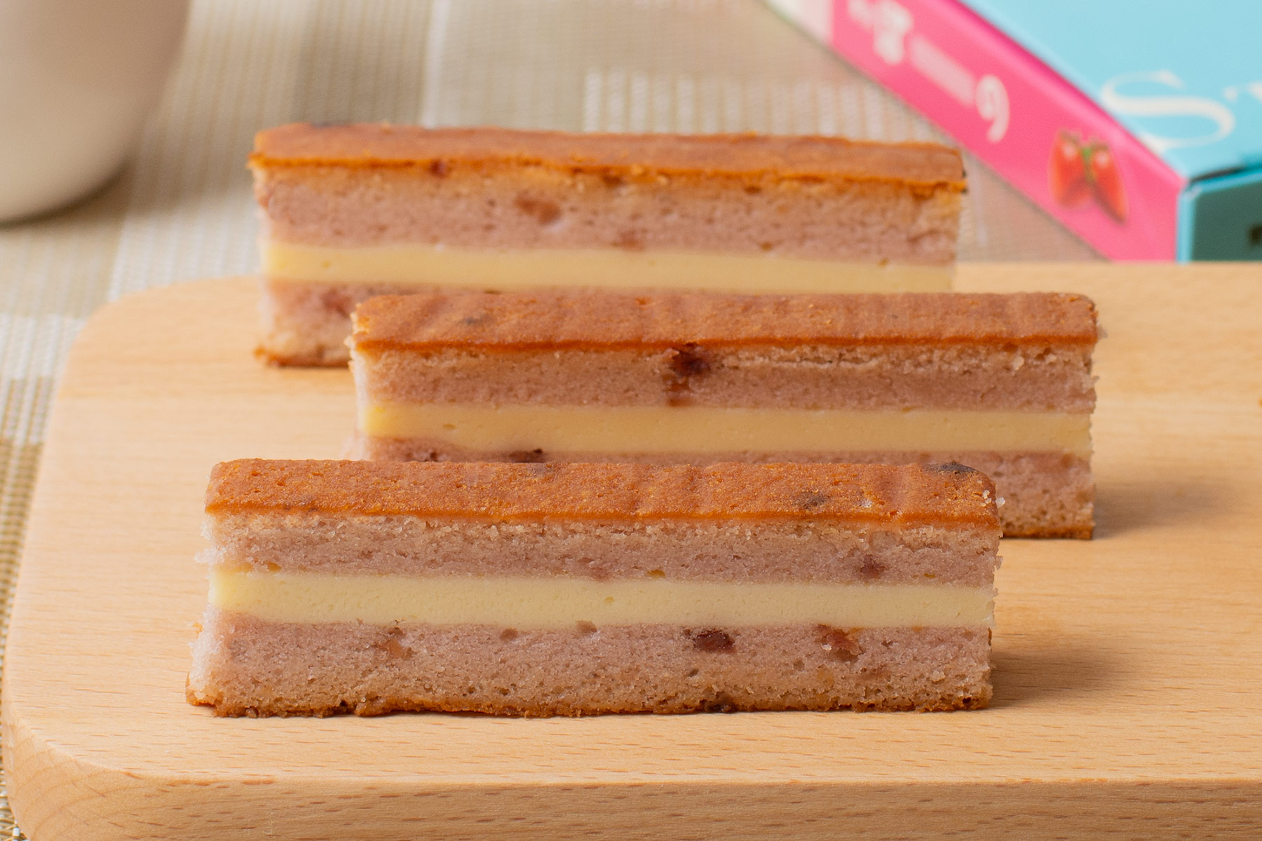 いちご濃縮果汁とフリーズドライを練り込んだカステラには、いちご本来のフレッシュな香りと、甘酸っぱい美味しさにこだわりました。サンドするチーズにはまろやかなマスカルポーネチーズを使用。甘く香り立ついちごスイーツです。